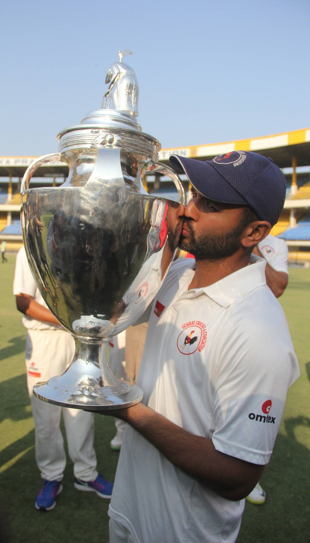 Gujarat captain Parthiv Patel kisses the prized 'Ranji Trophy'